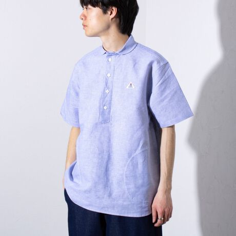 春夏らしい綿麻のシャリ感のある生地を使用した丸襟プルオーバー半袖シャツ。