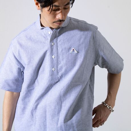 春夏らしい綿麻のシャリ感のある生地を使用した丸襟プルオーバー半袖シャツ。