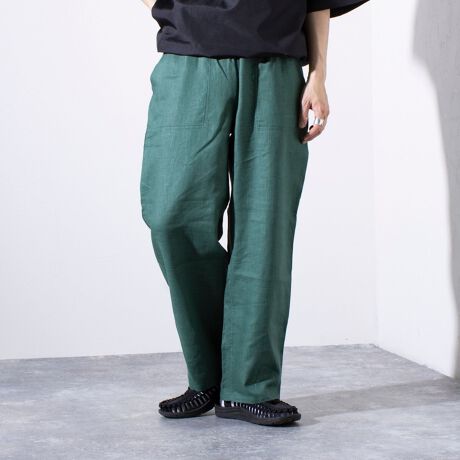 春夏らしい清涼感のある綿麻素材を使用したワイドシルエットのイージーパンツ。