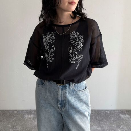 コーデのアクセントになる刺繍が華やかなシアープルオーバー