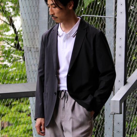 表面は綿糸で編み、裏面を清涼感のあるポリエステル糸「COOLMAX」で編んだ二層構造の吸水速乾生地を使用したテーラードジャケット
