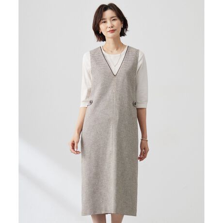 ■デザインストレートラインのジャンパースカート。いつものトップスに合わせるだけでサッとコーディネートが決まる優秀アイテム。シャープな印象のすっきりとした深めのVネックラインがポイントです。インナー次第でキレイ目からカジュアルまで幅広いコーディネートが楽しめる1着です。