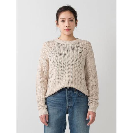 [型番:0013A0000]リブ編みクルーネックニット。ベージュカラーのデザインで、綿78%、麻22%で春先から暖かくなる季節まで着れる万能アイテム。パンツやスカートとの相性がばっちりです。model:165cm B80 W59 H87 着用サイズ:S