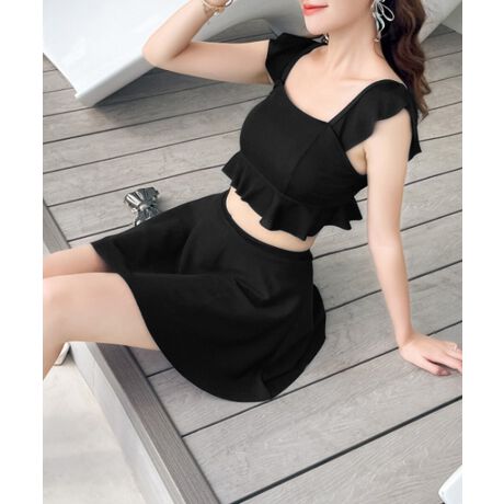 スクエアネックがフェミニンな印象を演出し、ウエストのフリルがスタイルアップもかなえる