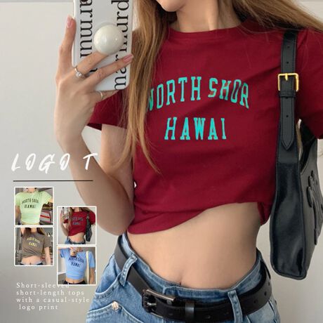 ロゴプリントがカジュアルスタイルのアクセントになる半袖ショート丈トップス