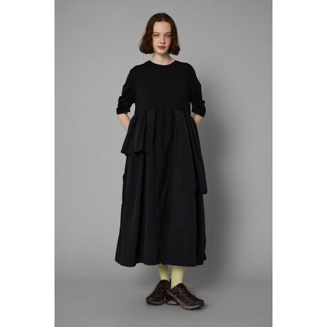 異素材ドッキングが印象的なカットワンピース。艶感のあるカット素材とマットな見え方の布帛素材を使用し、正反対の見え方を詰め込みました。ウエストラインでギャザーをふんだんに使い、フレアに広がるゆとりあるシルエットに仕上げ、軽いカット素材も相まって、イージーに体系カバーもしてくれる優れもの。独特なディテールとフォルムデザインが印象的なアイテムです。タックスリーブドッキングドレス[注意事項] ※画像の商品はサンプルです。実際の商品と仕様、加工が若干異なる場合があります。 ※画像の商品は光の照射や角度、お使いのモニター環境により、実物と色味が異なる場合がございます。 ※着用、お取り扱いの際は、アテンションタグをご確認ください。
