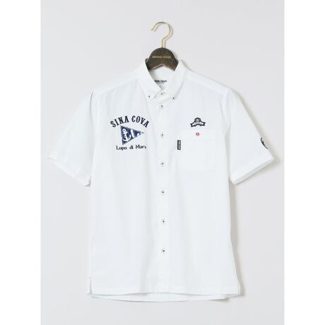 レーシングシャツをイメージした、ボタンダウンの半袖シャツです。前身頃には胸のフラッグ刺繍・ワッペン・ピスネームを付け、後身頃には蛍光色のハンガーフックと、シナコバSとイタリアの国番号39をプリントしています。SINA COVA(シナコバ)らしい遊び心のあるデザインはスタイリングの主役にぴったりです。