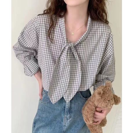 クラシックなギンガムチェック柄とリボンタイデザインが特徴のシャツ。綿100%で柔らかな肌触りと通気性に優れており、軽やかな着心地で春秋におすすめな一枚です。