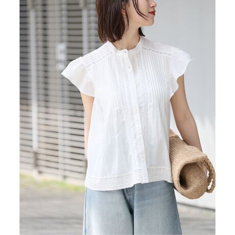 胸元のピンタックと透かしレースがポイント。