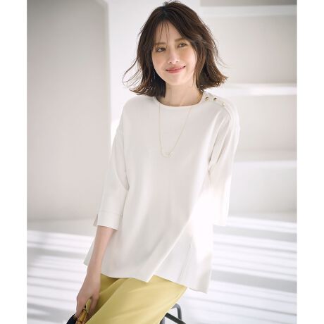 ・シンプルながらも腰回りをカバーできる・1枚で決まるフレアシルエットのプルオーバー・肩のボタンもポイント・肘にかかる袖丈と袖口のスリットで抜け感を演出