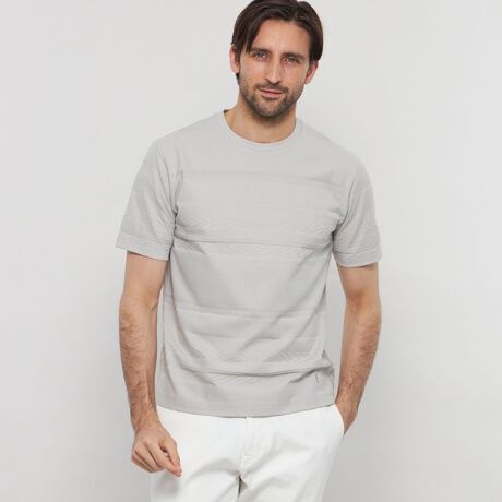 特殊な編み機で編んだしっかりとハリのある生地感のリンクス編みのボーダー素材です。生地の表面にはニットのように凹凸感のある表情豊かな柄があります。仕上げにシルケット加工を施すことで、適度な光沢感が出てきれい目な印象に仕上がりました。