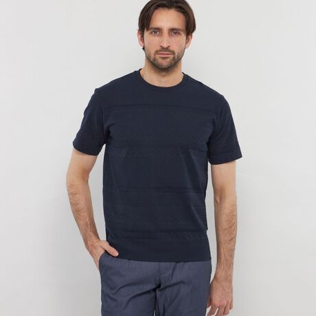 特殊な編み機で編んだしっかりとハリのある生地感のリンクス編みのボーダー素材です。生地の表面にはニットのように凹凸感のある表情豊かな柄があります。仕上げにシルケット加工を施すことで、適度な光沢感が出てきれい目な印象に仕上がりました。