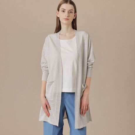ほんのり肌が透ける涼しげなロングカーディガンです。脇の編地を切り替えて縦のラインを協調し着用した時にスッキリとした印象です。また、脇スリットで動きのある軽快感をプラスしています。