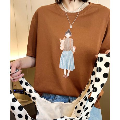 女性のイラストが描かれたシンプルなデザインのカジュアルTシャツ。プリントが華やかでありながらも落ち着いた印象を与え、どんなスタイルにも合わせやすい一枚です。ゆったりとしたシルエットで、リラックスした着心地が魅力です。