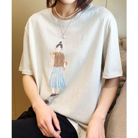 女性のイラストが描かれたシンプルなデザインのカジュアルTシャツ。プリントが華やかでありながらも落ち着いた印象を与え、どんなスタイルにも合わせやすい一枚です。ゆったりとしたシルエットで、リラックスした着心地が魅力です。