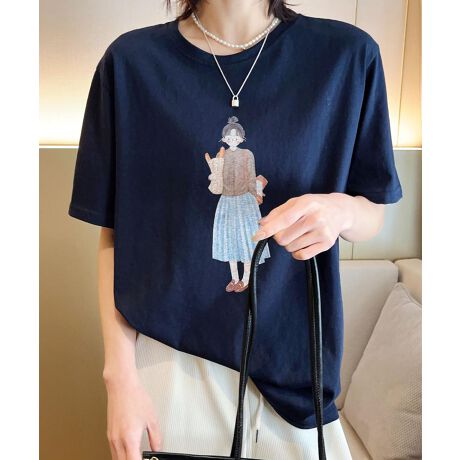 女性のイラストが描かれたシンプルなデザインのカジュアルTシャツ。プリントが華やかでありながらも落ち着いた印象を与え、どんなスタイルにも合わせやすい一枚です。ゆったりとしたシルエットで、リラックスした着心地が魅力です。