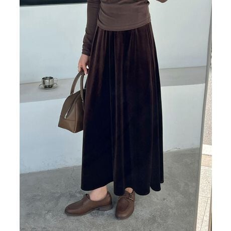 高級感あふれるベロア素材を使用したスカート。柔らかな光沢感とドレープが上品さを引き立てます。ウエストはゴム仕様で、履き心地が快適でフィット感も抜群。動きやすさとエレガンスを兼ね備えたデザインで、カジュアルからきれいめスタイルまで幅広く活躍します。