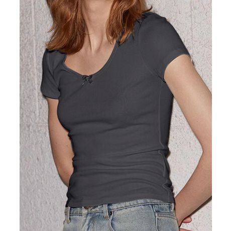 シンプルなデザインで、胸元に小さなリボンが施されたTシャツです。柔らかい素材感が肌に優しく、適度にフィットするデザインでスタイルアップ。シンプルながらも細部にこだわりが感じられ、デイリー使いに最適なアイテムです。