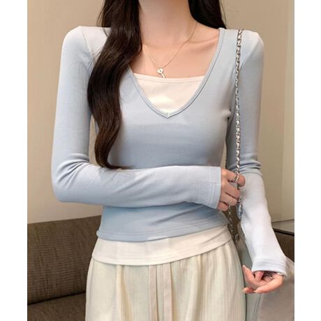 Vネック長袖リブトップス