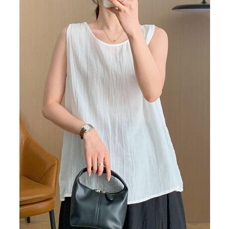 リラックス感たっぷりで、女性らしい雰囲気を引き立てるノースリーブのクルーネックトップス。軽量で通気性に優れたラミー素材が、暑い季節でも快適な着心地を実現します。動きやすさと心地よさを兼ね備え、日常のあらゆるシーンにぴったりのアイテムです。