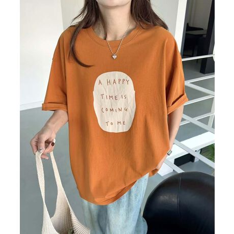 胸元に「A HAPPY TIME IS A GOOD LUCK」のメッセージが印刷されたTシャツ。シンプルながらもメッセージが引き立ち、カジュアルでありながら上品さも感じさせる一着です。