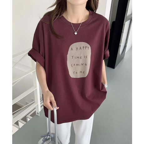 胸元に「A HAPPY TIME IS A GOOD LUCK」のメッセージが印刷されたTシャツ。シンプルながらもメッセージが引き立ち、カジュアルでありながら上品さも感じさせる一着です。