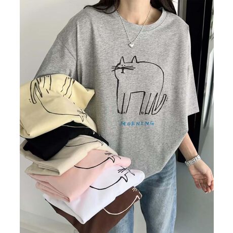 大きな猫のイラストが特徴的な可愛らしいTシャツ。シンプルでありながらも、個性的なデザインがアクセントになります。リラックス感のあるゆったりとしたシルエットで、どんなコーディネートにも合わせやすいアイテムです。