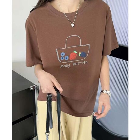 シンプルなデザインで、フロントにかわいらしいプリントが施されています。丸い襟元と適度にゆったりとしたシルエットが特徴的。日常使いに最適な、カジュアルで着回しやすいアイテムです。