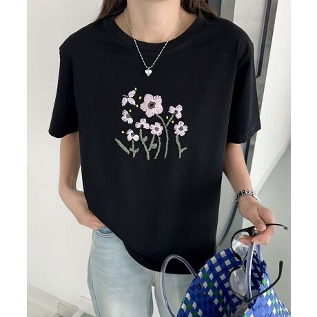 フロントに花柄がプリントされ、柔らかな印象を与えるデザインです。丸襟のシンプルなシルエットで、リラックスした着心地でどんなコーディネートにもぴったり。女性らしさを引き立てるアイテムです。