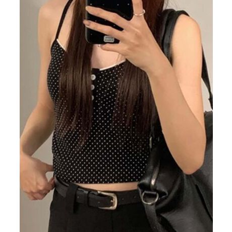 女性らしい印象を引き立てるドット柄が特徴。前面に施されたボタンデザインがアクセントとなり、シンプルでありながら魅力的なデザイン。細めの肩紐とV字型のデコルテラインが上品でありながらもカジュアルな雰囲気に。