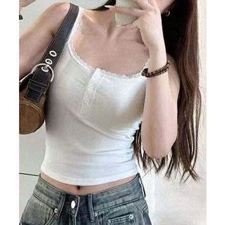 爽やかなストライプ柄とレースのトリムが特徴。シンプルながらも、女性らしさを引き立てるデザインです。ボタンデザインと細めのストラップでカジュアル感UP。リラックスできる着心地で、デイリーコーディネートにぴったり。
