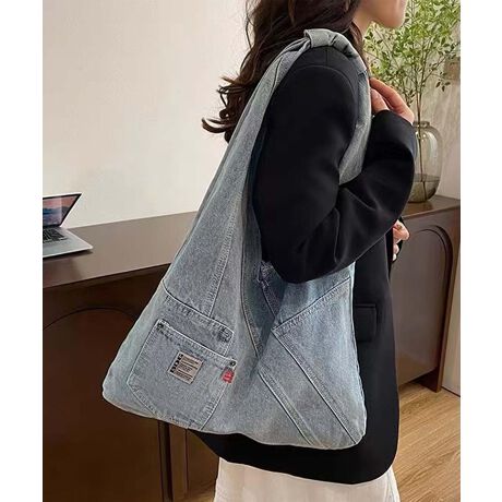 斜めに切り替えられたデニム風素材が特徴的で、異なる色合いが個性的な印象を与えます。軽量でありながら充分な収納力。肩にかけて使えるので、持ち運びが便利で、使い勝手の良いデザインとなっています。