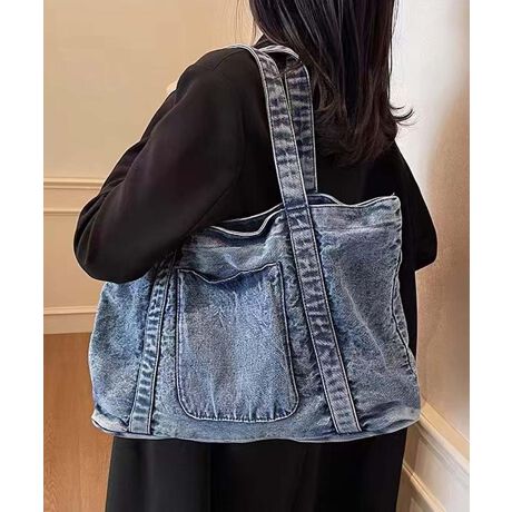 ヴィンテージ感漂うデザインのデニムトートバッグ。日常使いにぴったりの大容量サイズで、シンプルながらおしゃれな印象を与えるアイテムです。