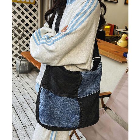 異なるデニムをパッチワークで組み合わせたユニークなデザインが特徴です。たっぷり収納できる大容量が魅力。肩にかけて使えるので、長時間持ち歩いても肩に負担がかかりにくい設計です。シンプルでありながら、デニムのカジュアル感が引き立ちます。