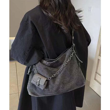 デニムとチェーンアクセントが特徴的なショルダーバッグ。日常使いやお出かけにぴったりのアイテムです。