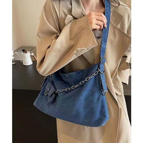 デニムとチェーンアクセントが特徴的なショルダーバッグ。日常使いやお出かけにぴったりのアイテムです。