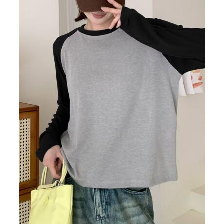 ラグランスリーブが特徴的なカジュアル長袖Tシャツ。異なる色の袖とボディが絶妙なバランスを作り出し、シンプルながらもスタイリッシュな印象を与えます。リラックス感のあるシルエットが、日常のどんなシーンにもぴったりです。
