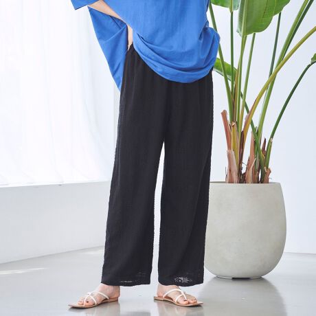 立体的な幾何学模様が印象的な、軽やかで涼しげなサマーパンツ。