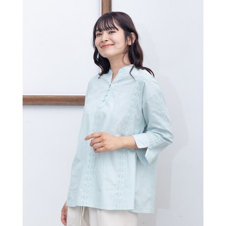 たて柄の刺しゅうがカジュアル過ぎず、首元がスッキリ見えるスキッパー仕様のブラウスです。手首を華奢に見せてくれる袖丈で様々なボトムと相性がいいです。デイリーに活躍してくれる一枚です。