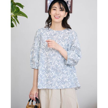 夏らしいフルーツ柄のブラウスです。単色なので合わせやすくプリントが苦手な方にも取り入れやすいです。綿麻の素材で涼しく、後ろの切り替えをフレアーにして女性らしいシルエットにしています。