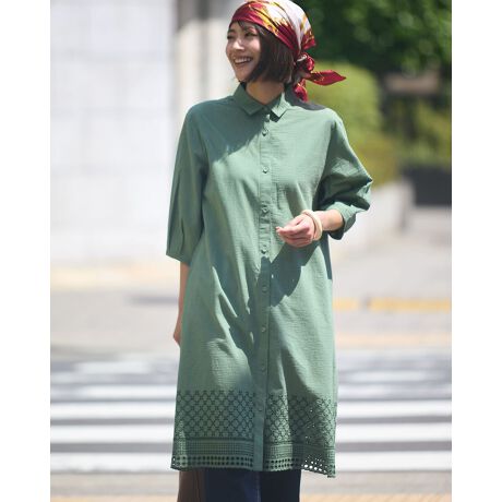 生地は凹凸があり、肌離れの良いオーガニックコットンを使用したロングシャツです。裾に入れたカットワークが大人かわいい印象です。羽織としてもおすすめでカジュアルコーデも上品にまとまります。
