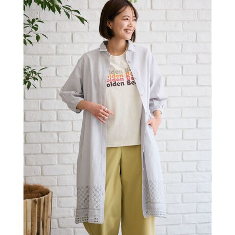 生地は凹凸があり、肌離れの良いオーガニックコットンを使用したロングシャツです。裾に入れたカットワークが大人かわいい印象です。羽織としてもおすすめでカジュアルコーデも上品にまとまります。