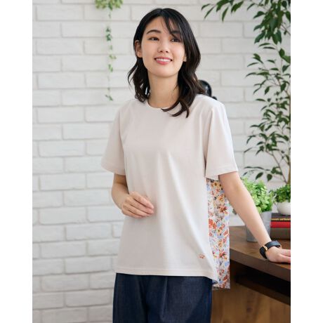 後身頃に花柄のプリント素材を切り替えたデザインTシャツです。脱ぎ着がしやすいようにバックネックがゴム仕様になっています。裾のクマ刺しゅうがアクセントです。