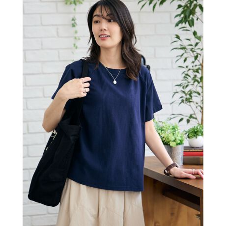 正面にジャカード素材を切り替えたTシャツです。袖のラインをラグランスリーブにして異素材の組み合わせをより活かせるようなデザインにしました。裾にクマのワンポイント刺繍つき。