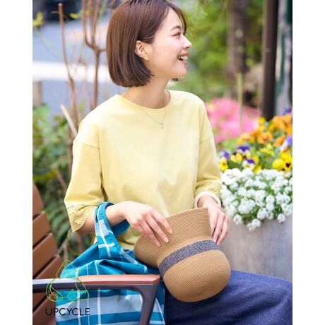 廃棄植物染めの素材を使用したTシャツです。ボディに合わせて切り替えのレースも同色に染めました。明るいイエロー系とネイビーの2色展開です。