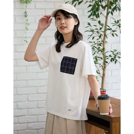GOLDENBEARのオリジナルチェックをポケットに使用したシンプルなTシャツ。セットインスリーブですが、窮屈にならないシルエットで作りました。裾のクマ刺しゅうがアクセントです。