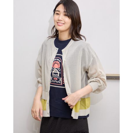 程よく透け感のある素材を使用したカーディガンです。身幅と袖幅をゆったり取ったデザインになっています。袖をたくしあげてニュアンスを出せるように仕上げています。裾には配色のデザインポイント。タンクトップにサラッと羽織ったレイヤードスタイルがオススメです。