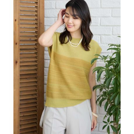 WHOLEGARMENTで編み上げたニットベストです。ガーターの編みに強弱をつけ表情ある1枚に仕上げています。レイヤードスタイルはもちろん、1枚でノースリーブとしての着用もおすすめです。