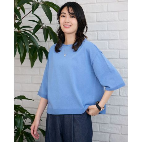 和紙とポリエステルの糸を使用しホールガーメントで編んだプルオーバーです。清涼感ある凹凸感をお楽しみいただけます。