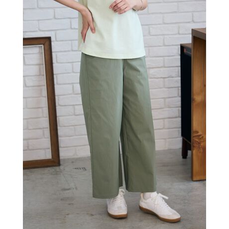 前脇から後ろウエストにかけて施されたギャザーゴムが、リラックスしたはき心地を実現しつつ、フロントはすっきりとしたフラットなデザインで、気になるお腹周りをすっきり見えるようにしています。カジュアルからきれいめまで、幅広いスタイリングにマッチする、大人のガウチョパンツです。